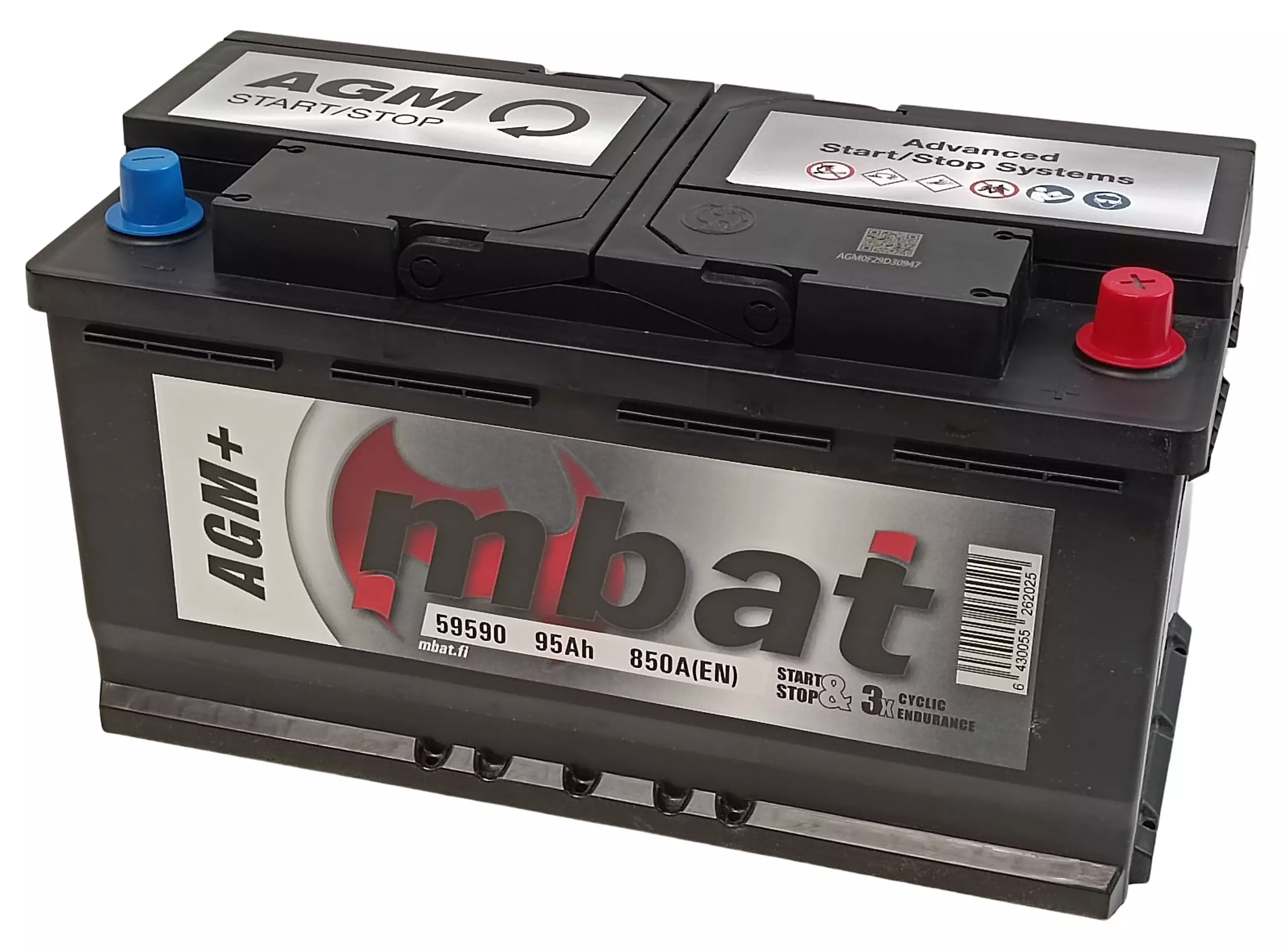 Käynnistysakku AGM Start-Stop. Laitteisiin joissa kehittynein Start-Stop järjestelmä ja akku sijoitettu sisätilaan.