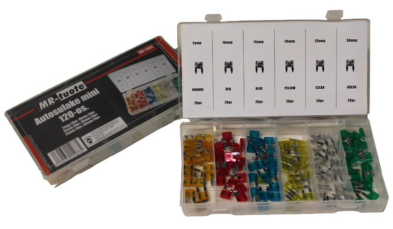 120kpl minisulakelajitelma autoon. Sisältää: - 20kpl 5amp - 20kpl 10amp - 20kpl 15amp - 20kpl 20amp - 20kpl 25amp - 20kpl 30amp