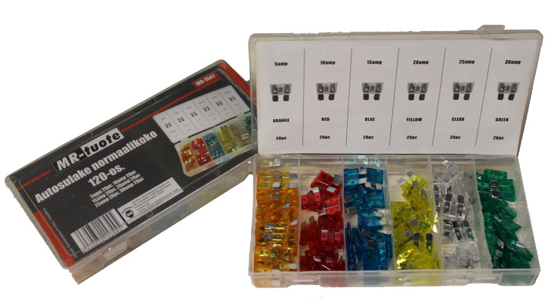 Kattava autosulakevalikoima. - 120 osainen setti - Setissä on 20 kpl jokaista kokoa - Koot ovat 5 amp, 10 amp, 15 amp, 20 amp, 25amp ja 30 amp
