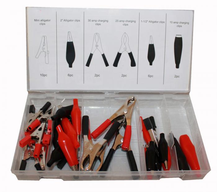Erikokoisia latauspuristimia näppärässä säilytysrasiassa, jossa ne pysyvät hyvässä järjestyksessä. Pakkauksessa 28kpl hauenleukoja.