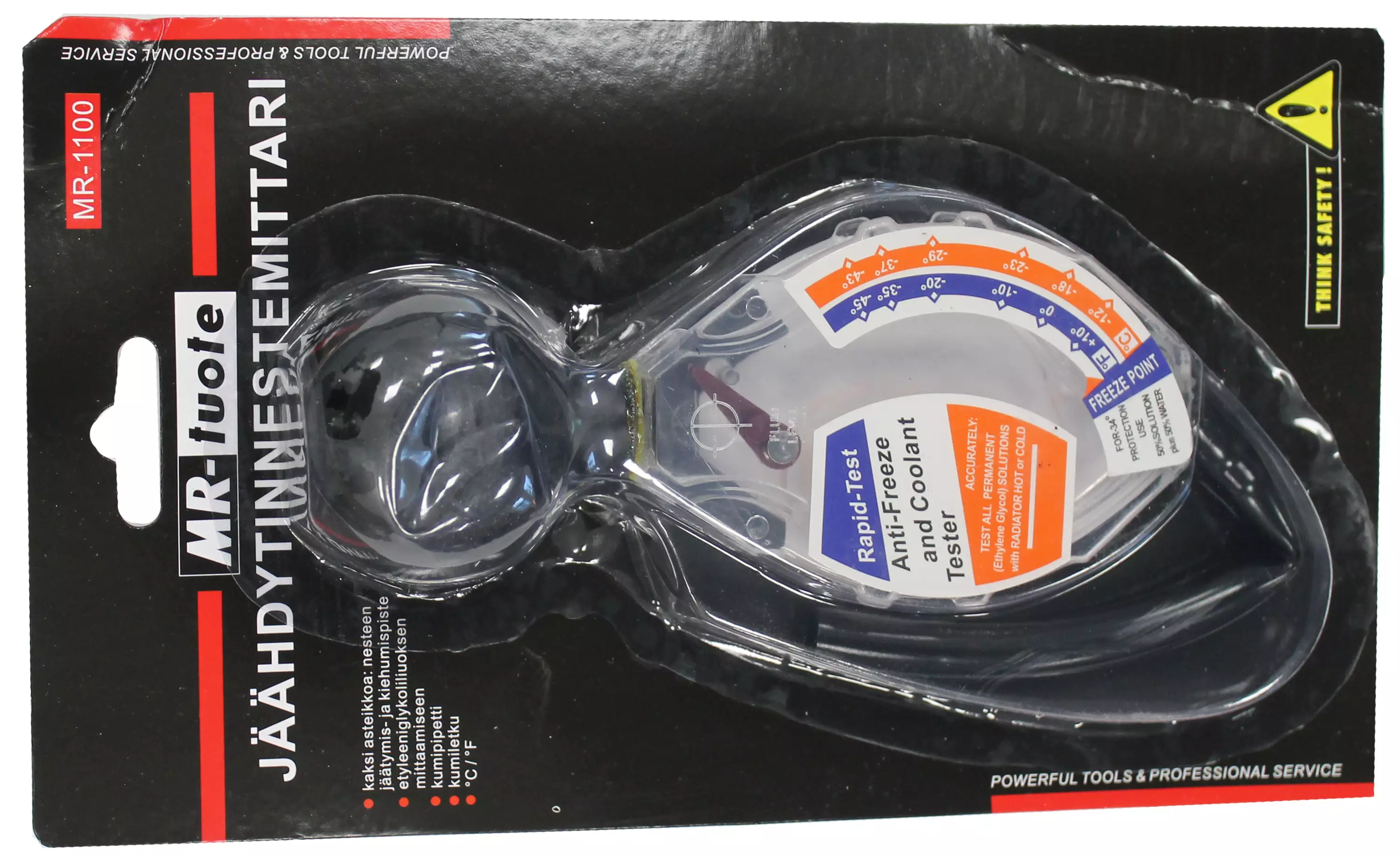 Helppolukuinen jäähdytysnestemittari. Kaksi asteikkoa: nesteen jäätymis- ja kiehumispiste.