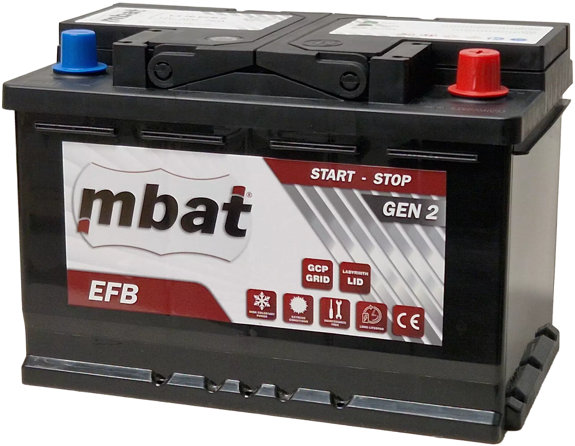 Käynnistysakku MBAT EFB on tarkoitettu laitteisiin joissa Start-Stop toiminto ja (myös) jarrutusenergian talteenotto, eikä valmistaja vaadi käytettäväksi AGM akkua. Uusien lisä ja apuaineiden ansiosta syklinen kestävyys ja virran vastaanottokyky on huomattavasti tavallista käynnistysakkua parempi. EFB akut soveltuvat myös tavallisen akun tilalle kun halutaan parempaa syklistä kestävyyttä ja starttitehoja. Stabiili toimintateho myös alhaisessa varaustilassa. Soveltuvuus mm. Audi, Volkswagen, Renault, Peugeot, Skoda, Mercedes, Seat,ym..Syklinen kestävyys vähintään 2x tavalliseen akkuun verrattuna. Edistynyt hiiliteknologia (CarbonTech) mahdollistaa 30% nopeamman lataantumisen. Uusi spesiaali aktiiviaine kaava antaa korkeamman käynnistystehon alhaisissa lämpötiloissa. Uusi ristikkoseos lisää korroosion kestävyyttä 50%. 5-10% pienentynyt polttoaineen kulutus.Takuu 24kk.
