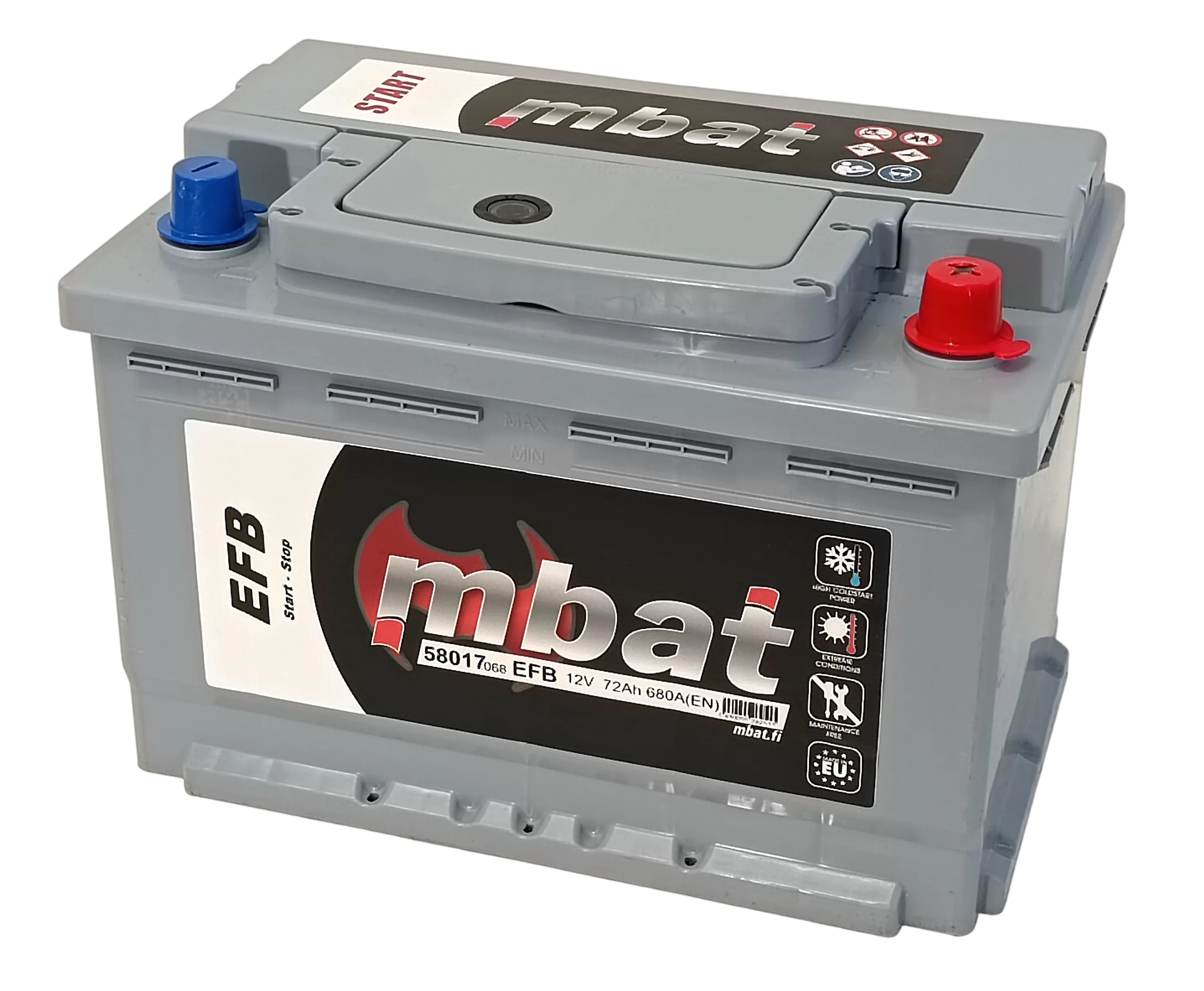 Käynnistysakku MBAT EFB on tarkoitettu laitteisiin joissa Start-Stop toiminto ja (myös) jarrutusenergian talteenotto, eikä valmistaja vaadi käytettäväksi AGM akkua. Uusien lisä ja apuaineiden ansiosta syklinen kestävyys ja virran vastaanottokyky on huomattavasti tavallista käynnistysakkua parempi. EFB akut soveltuvat myös tavallisen akun tilalle kun halutaan parempaa syklistä kestävyyttä ja starttitehoja. Stabiili toimintateho myös alhaisessa varaustilassa. Valmistettu Euroopassa. Soveltuvuus mm. Audi, Volkswagen, Renault, Peugeot, Skoda, Mercedes, Seat,ym..Syklinen kestävyys vähintään 2x tavalliseen akkuun verrattuna. Edistynyt hiiliteknologia (CarbonTech) mahdollistaa 30% nopeamman lataantumisen. Uusi spesiaali aktiiviaine kaava antaa korkeamman käynnistystehon alhaisissa lämpötiloissa. Uusi ristikkoseos lisää korroosion kestävyyttä 50%. 5-10% pienentynyt polttoaineen kulutus.Takuu 24kk.