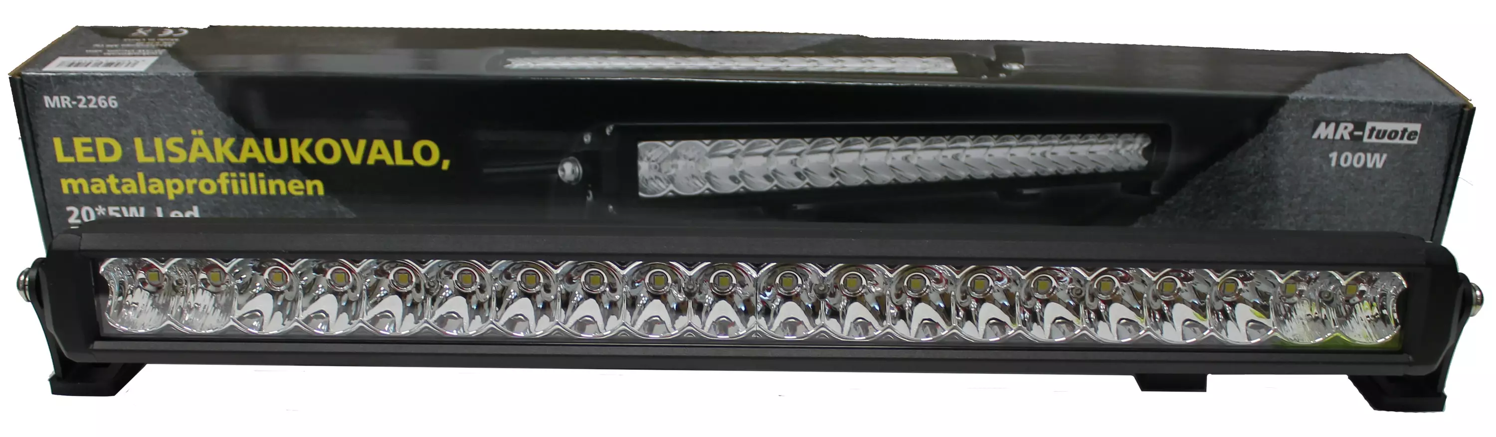 Pitkän ja leveän valokeilan tuottava matalaprofiilinen 100W lisäkaukovalo. Lisävalopaneelissa on 20kpl 5W Osram ledejä, joista syntyy tasainen valokuvio, joka antaa hyvän näkyvyyden pimeässä. Valon lämpötila on 6000K eli kylmä valkoinen, joka antaa tehokkaan lisävalon autoon, mönkijään tai työkoneeseen, kuten traktoriin.