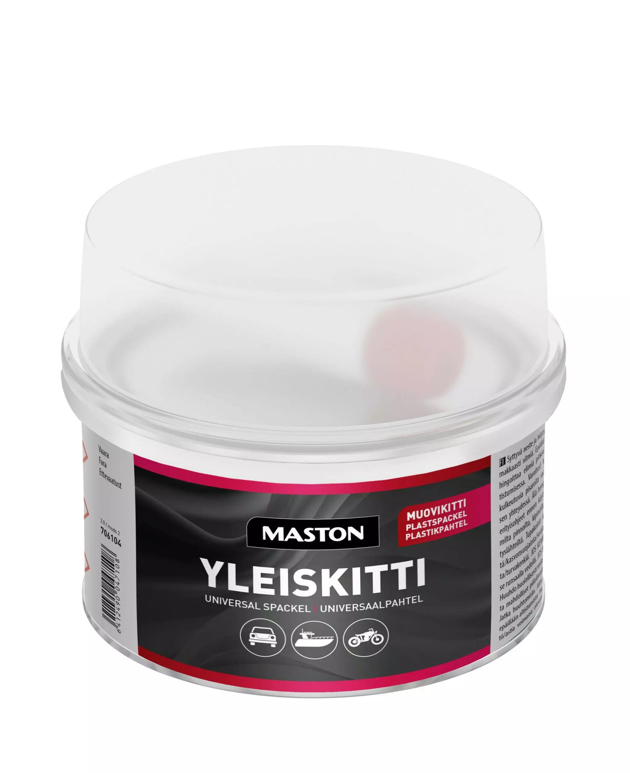 Maston Yleiskitti on muovikitti, jota suositellaan käytettäväksi täyteaineena syvien ja keskisyvien kolhujen ja reikien korjauksessa. Hyvät täyttö ja tasoittuvuus ominaisuudet sekä nopea kuivumisaika takaavat helpon käyttökokemuksen. Soveltuu useille alustoille mm. hiottu lasikuitu, puu (tasoituksen ja rasvanpoiston jälkeen) sinkitty teräs, alumiini ja paljas teräs. Soveltuu polyesterikitin tai pohjamaalin päälle edellyttäen, että pinnat ovat hyvässä kunnossa.