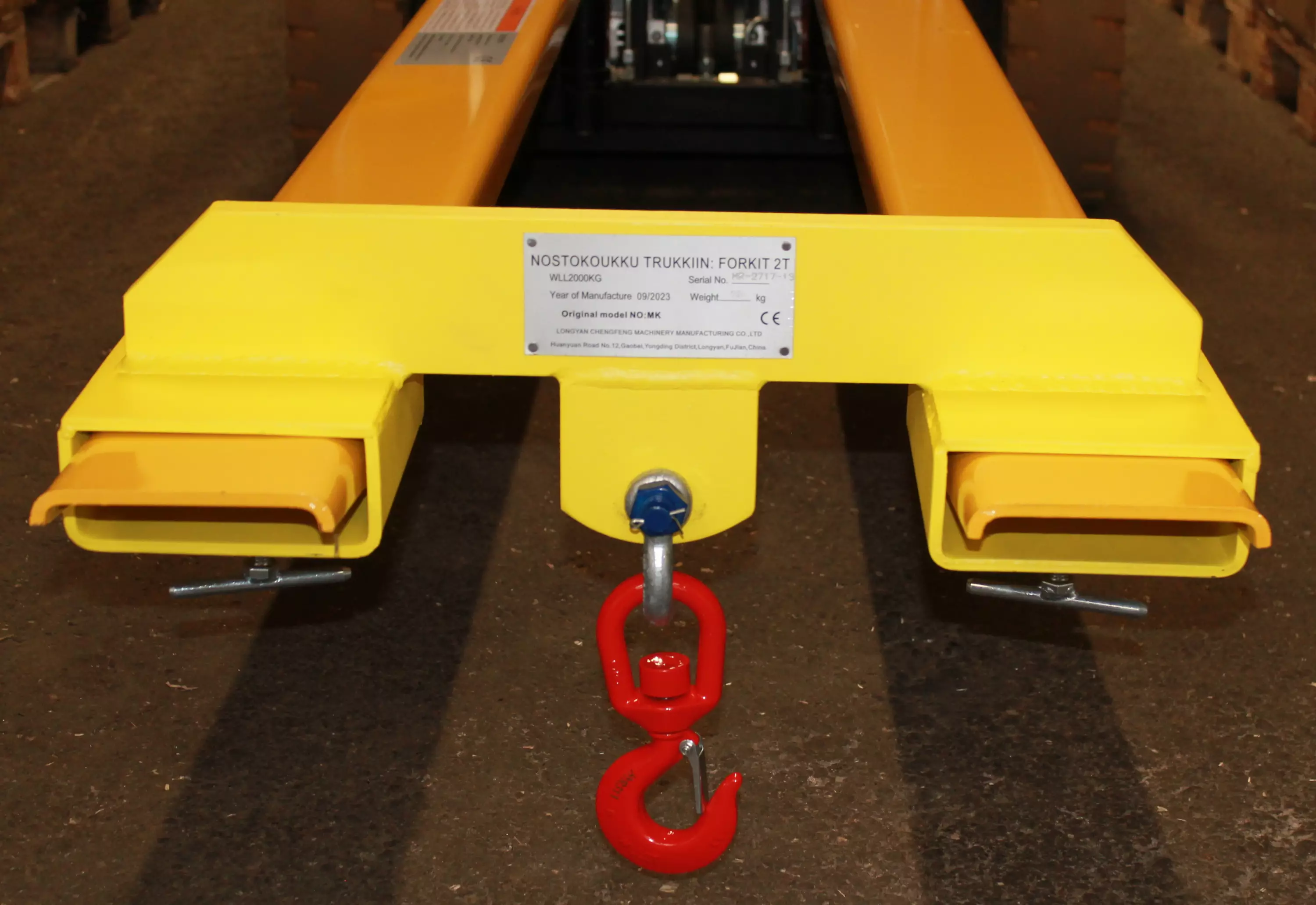 2 T Kuorman nostamiseen haarukkatrukilla molemmilla haarukoilla koko nostoteho. Lukittavissa haarukoihin mukana tulevilla pulteilla. CE