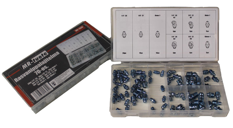 Lajitelma sisältää erikokoisia rasvanippoja, mm. 45° ja 90° kulmassa olevia. Rasiassa on yhteensä 70kpl rasvanippoja.