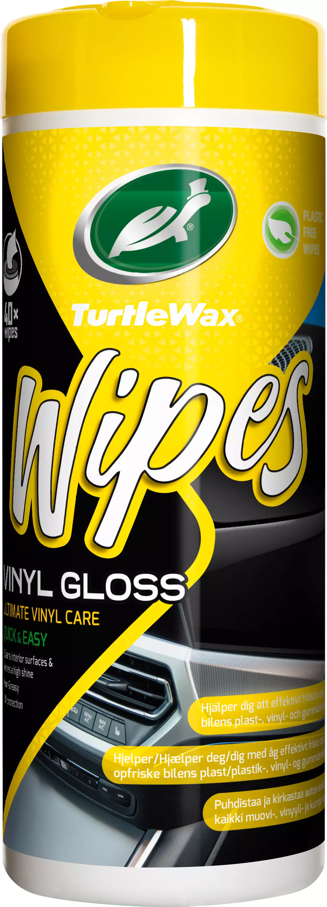 Puhdistaa tehokkaasti ja jättää suojaavan kiiltävän pinnan. Palauttaa muovin ja vinyylin alkuperäisen kiillon. Jättää puhtaan ja raikkaan tuoksun. Ilmatiivis purkki pitää liinat pitkään kosteina. 40 kpl kulutusta ja hankausta kestäviä liinoja. Liinojen materiaali on 100% muovitonta ja biologisesti hajoavaa.