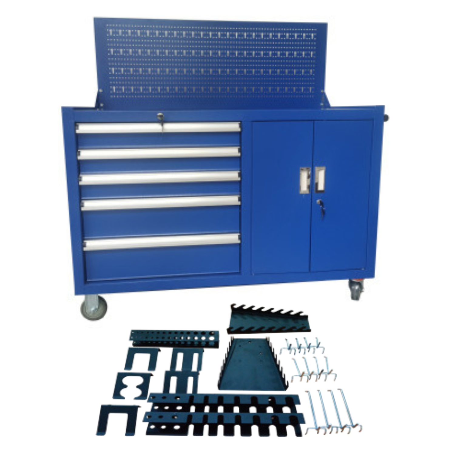 Liikuteltava työkalupöytä työkaluseinällä. Kestävän työkalukaapiston avulla nostat eniten käyttämäsi työkalut helposti esille ja luot täydellisen työpisteen juuri sinne ja juuri sellaiseksi kuin itse haluat. Työkalukaapistossa on viisi lukittavaa vetolaatikkoa sekä erillinen lukittava kaappi kaksoisovilla.