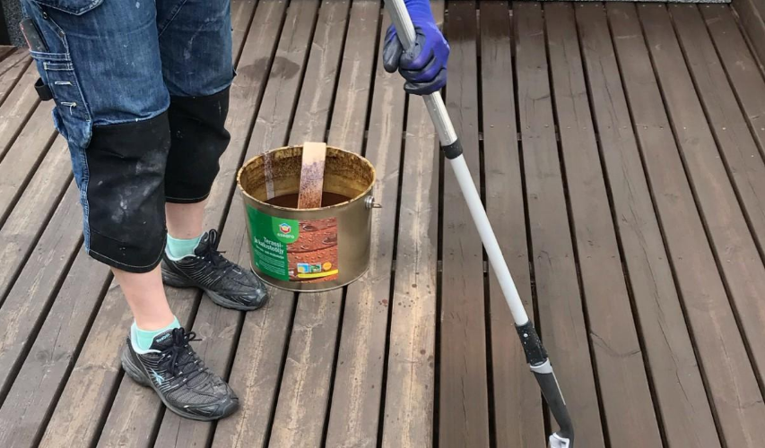 - Levitä öljy tasaisesti terassin pintaan esimerkiksi telalla tai siveltimellä. Huomioi erityisesti terassin reunat ja kulmat, joihin kertyy helposti kosteutta ja likaa. Älä käytä liikaa öljyä, jotta se ei jää pinnalle tippumaan.