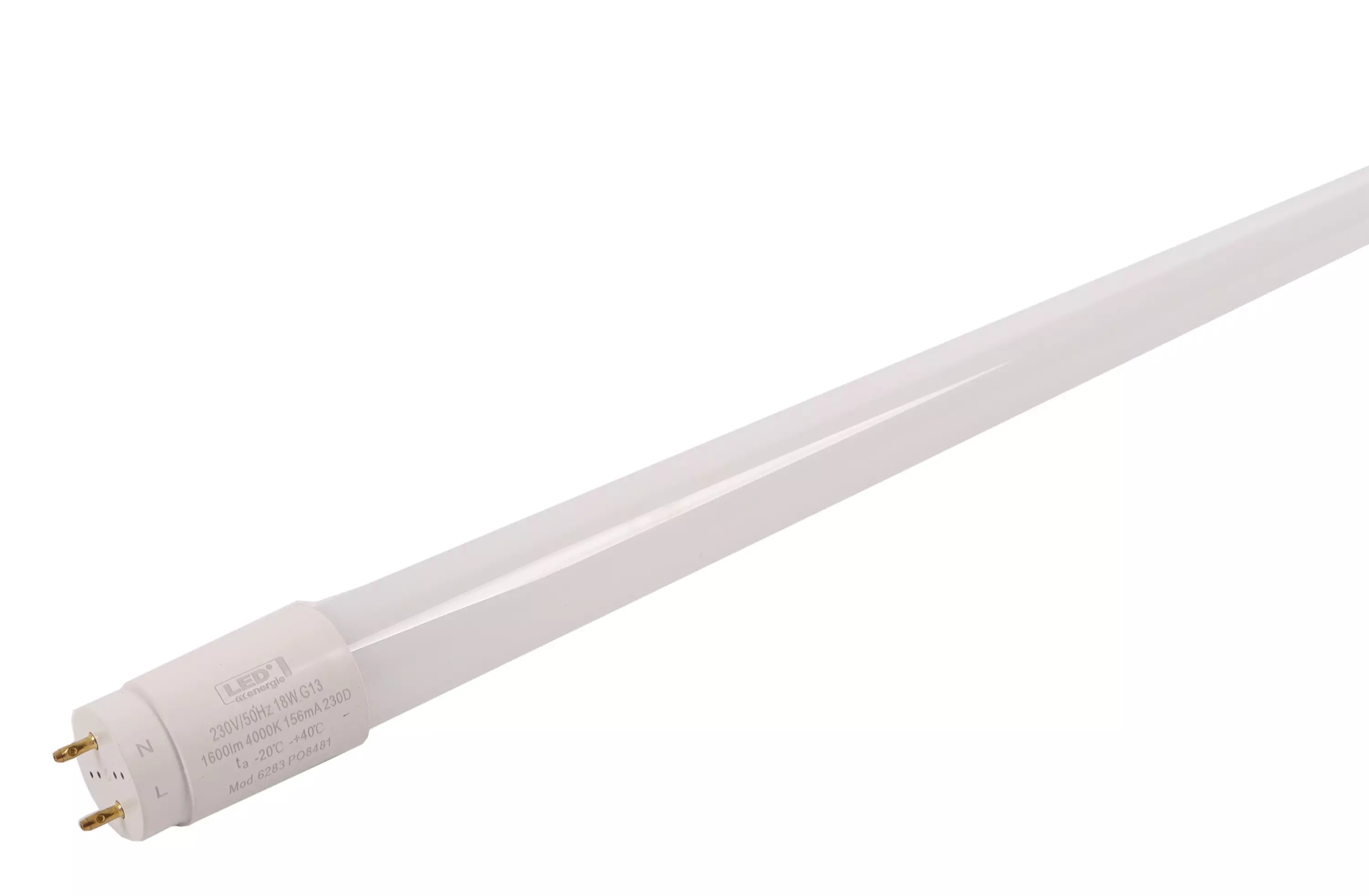 Perinteisen kuristimella varustetun loisteputken korvaava 18W 120cm LED-putki G13-kannalla. 230V/50Hz, 1600lm, 4000K, IP20.