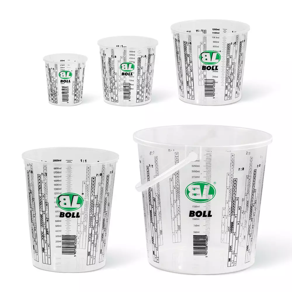Läpinäkyvästä muovista valmistetut yleiskäyttöiset astiat, joissa on painetut mitta-asteikot, jotka mahdollistavat seosten tarkan valmistamisen halutuissa suhteissa.