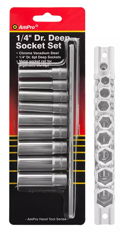 AmPro -korkealuokkaista kromi-vanadium- terästä -sarja sisältää 6PT pitkiä hylsyjä: 5.5, 6, 7, 8, 9, 10, 11, 12, 13 mm -IP-ripustinpakkaus -ikuinen materiaalitakuu