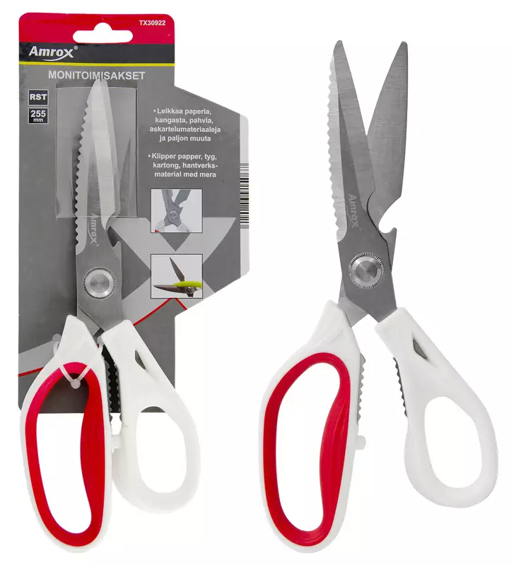 -materiaali: ruostumaton teräs -kokonaispituus: 255 mm -leikkauskuvio: hammastettu, suora -kaksikomponentti kahvat -saksissa pullonavaaja sekä naruleikkuri -IP-ripustinpakkaus -materiaalitakuu 1... Lue lisää