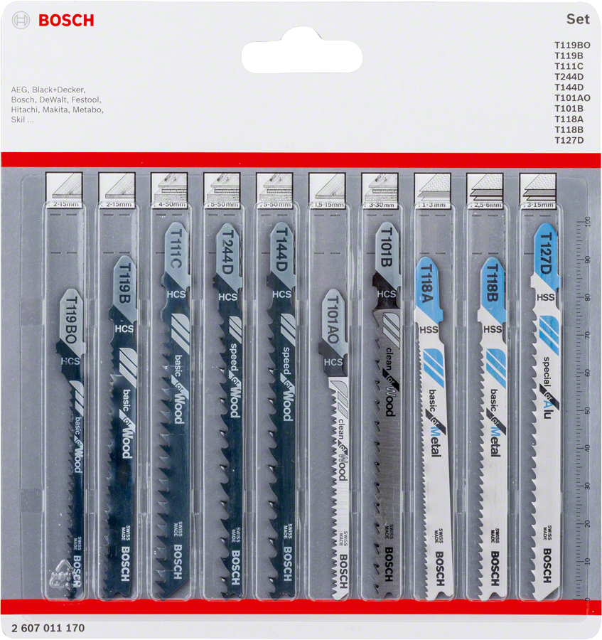 10-osainen pistosahanteräsarja puulle ja metallille. Sarjan sisältö T 119 BO Basic for Wood, T 119 B Basic for Wood, T 111 C Basic for Wood, T 244 D Speed for Wood, T 144 D Speed for Wood, T 101 AO Clean for Wood, T 101 B Clean for Wood, T 118 A Basic for Metal, T 118 B Basic for Metal ja T127 D Special for Alu.