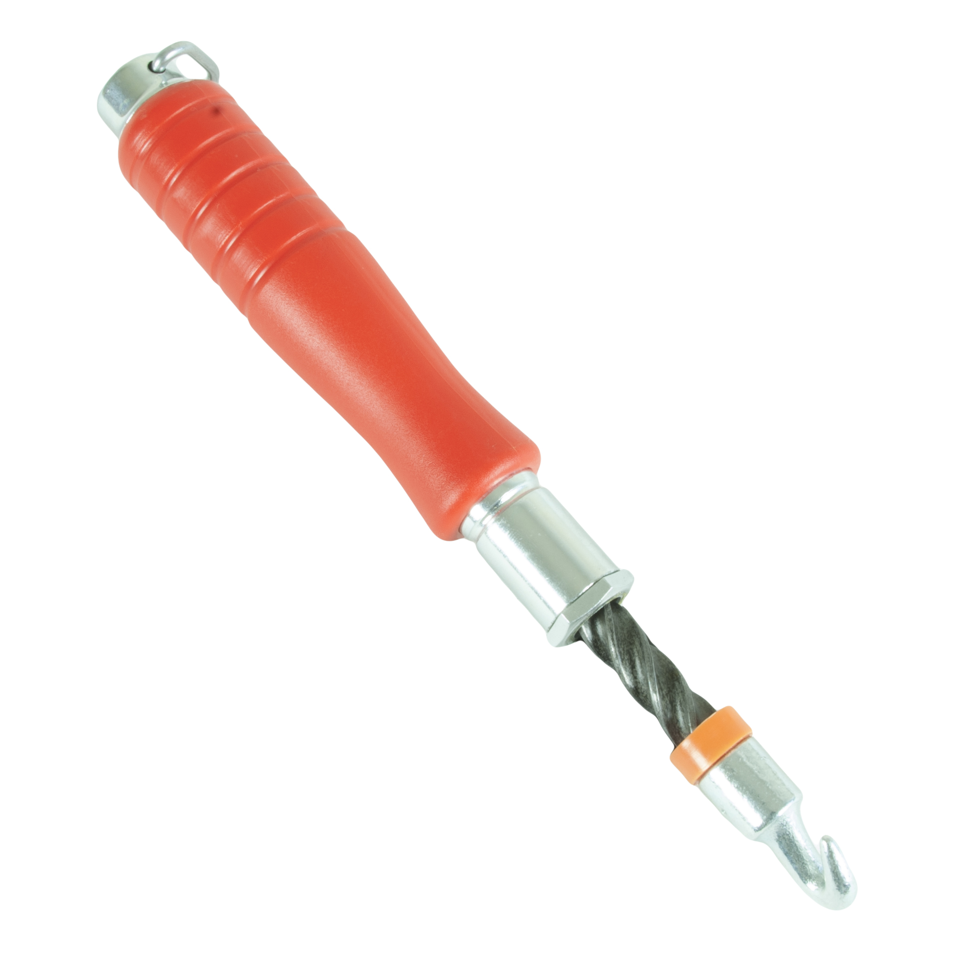 Raudoituskoukku, joka automaattisesti kiertää sidelangan kierteelle ylöspäin vetäessä. Muovinen kädensija. Yksi täysi veto kierää lankaa 720 astetta.