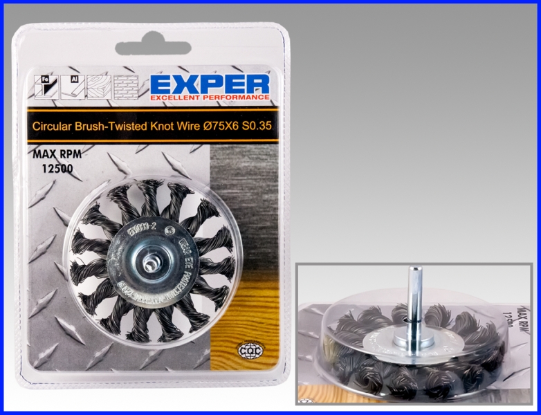 Lautasharja Ø75 mm porakoneeseen. Ø0,35 mm palmikoitu teräslanka. Ruosteen - ja maalinpoistoon ja puhdistukseen porakoneella.