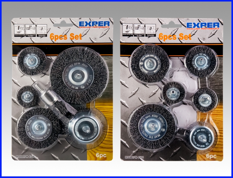 6-osainen teräskaraharjasarja ruosteen- ja maalinpoistoon ja puhdistukseen. Teäskuppiharja Ø50mm, teräskaraharjat 2 kpl Ø38mm, Ø50mm, Ø63mm ja Ø75mm.