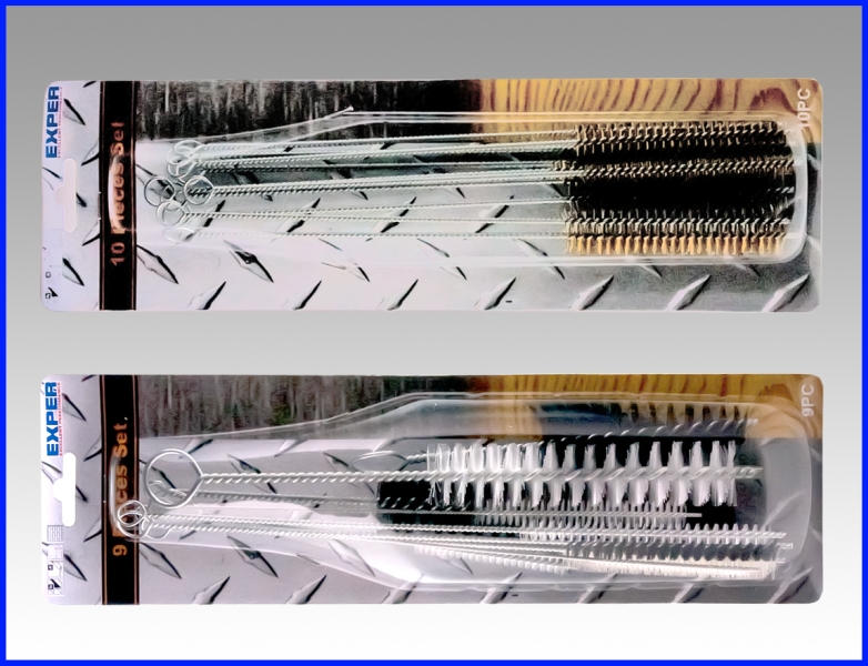 5 kpl pyöreitä rst-harjoja ja 5 kpl pyöreitä messinkiharjoja. Rst-harjat Ø19x100mm, Ø12x100mm, Ø9,5x100mm, Ø8x100mm ja Ø6,5x100mm. Messinkiharjat Ø19x100mm, Ø12x100mm, Ø9,5x100mm, Ø8,5x100mm ja Ø6,5x100mm.