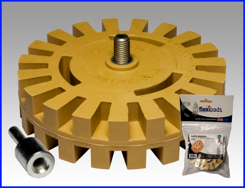 Flexipads Toothed Decal Eraser tarranpoistolaikka TE400,”Toffeelaikka”.Poistaa tarrat, teipit ja liimajäämät nopeasti.Halkaisija Ø100 mm ja leveys 25 mm, kara Ø 6mm porakoneisiin.Maksimikierrosluku 4000 r/min.