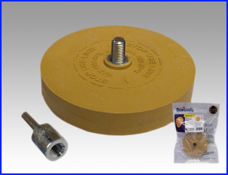 Flexipads Tape Eraser teipinpoistolaikka TE300,”Toffeelaikka”.Poistaa teipit, tarrat ja liimajäämät nopeasti.Hellävarainen maalipinnoille.Halkaisija Ø88 mm ja leveys 15 mm, kara Ø 6mm porakoneisiin.