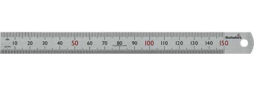 Yläreunassa millimetriasteikko, alareunassa puolikkaat millimetrit. Punaiset desimetrinumerot.