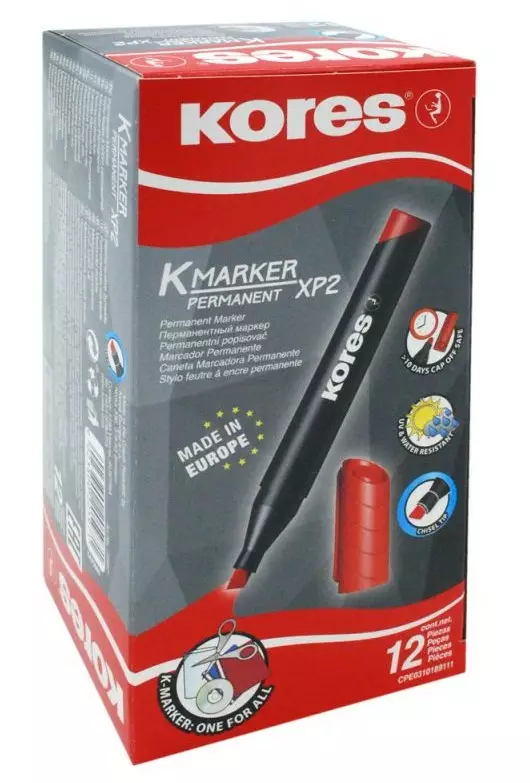 Huopakynä Kores Permanent XP2, punainen, viisto. Viisto 3-5 mm:n terä. Sopii kaikille pinnoille, myös CD:lle. Myrkytön, ei sisällä ksyleeniä, tolueenia eikä bentseeniä. Ilman korkkia kestää...