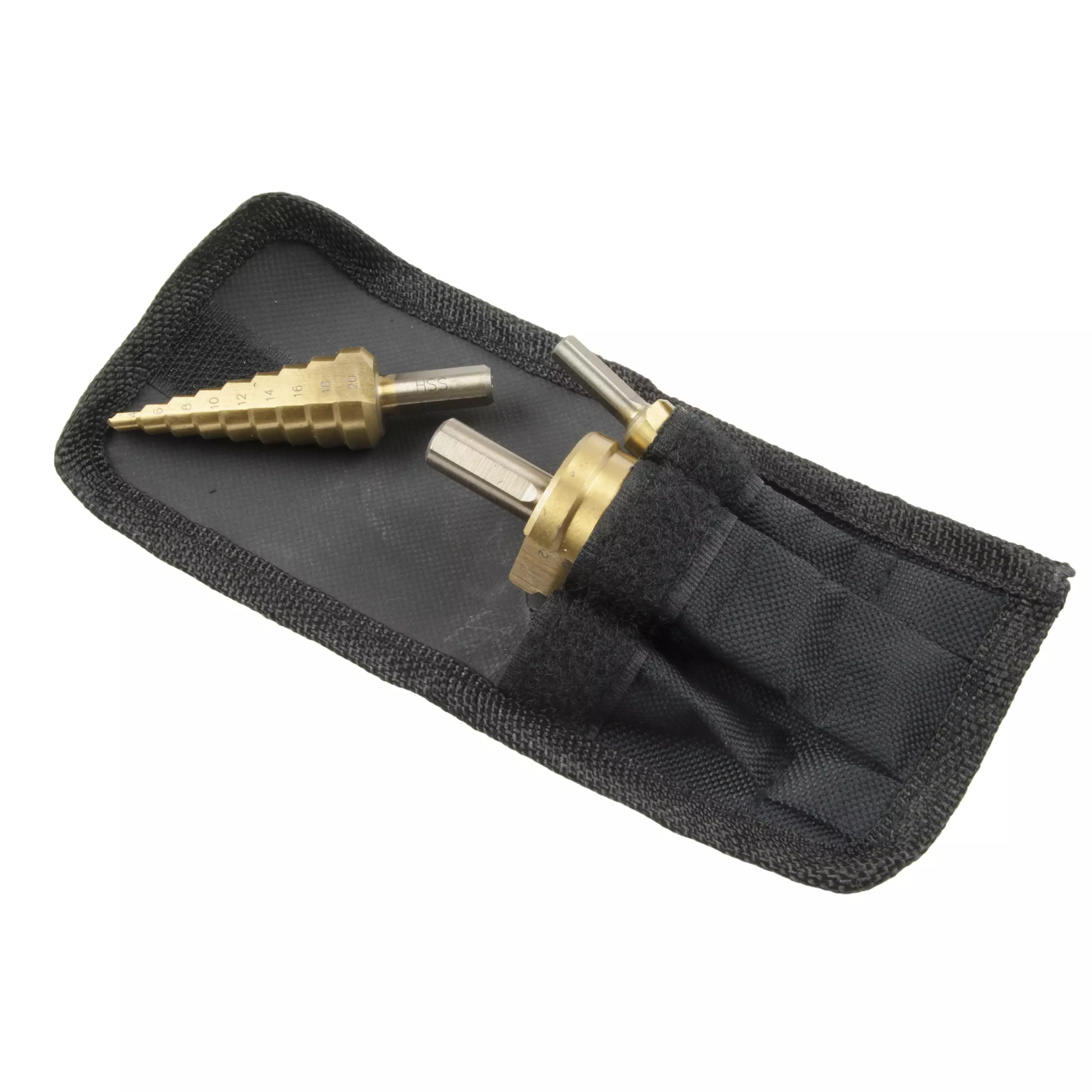 Pakkauksessa kolme erikokoista levyporaa sekä säilytyspussi. Terien koot 4-12mm, 4-20mm ja 4-32 mm