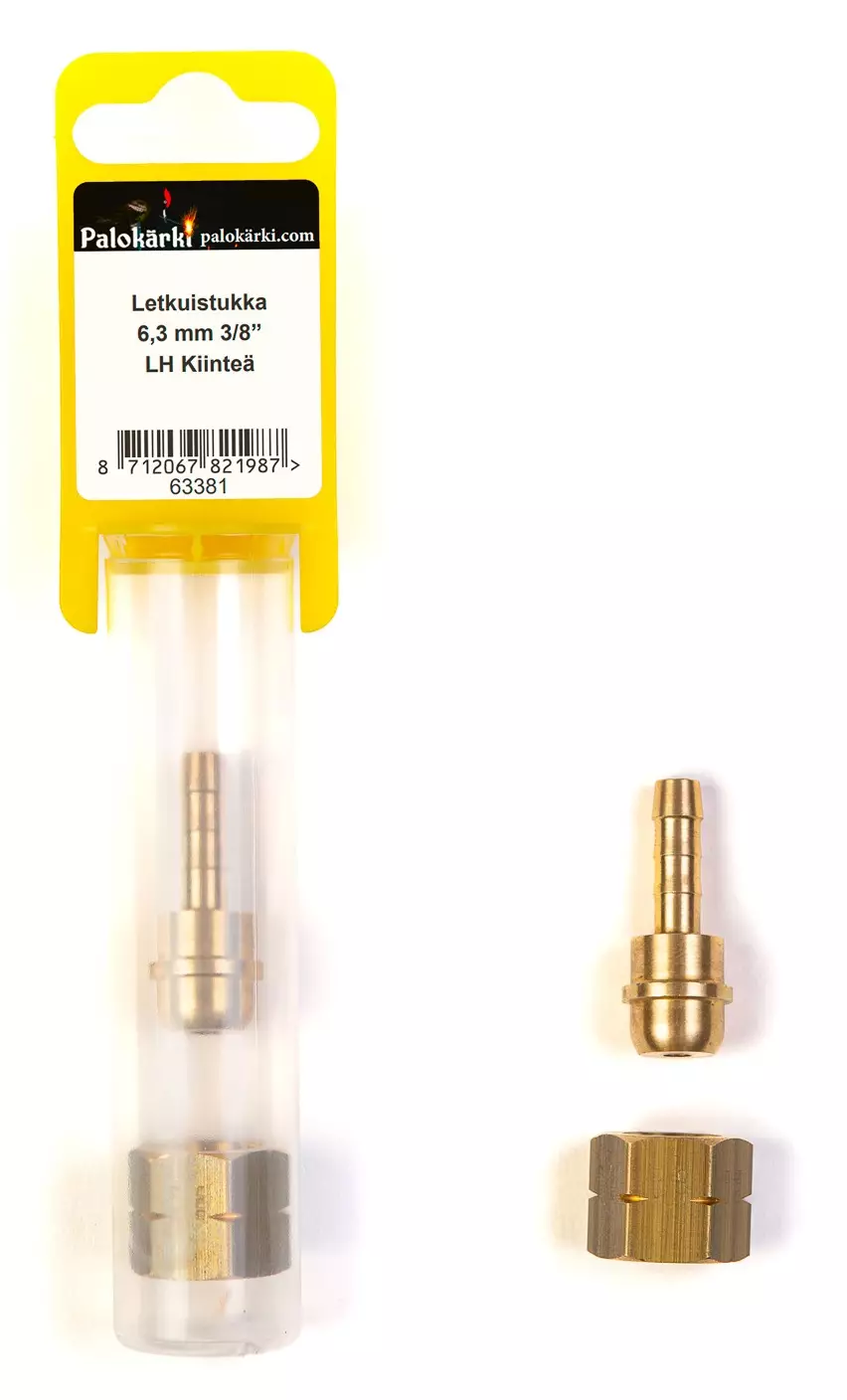 Täysmessinkinen korkealaatuinen letkuistukka. Sisältää 3/8" vasenmutterin. Liitoskierre BSP 3/8" LH 6,3 mm letkulle.