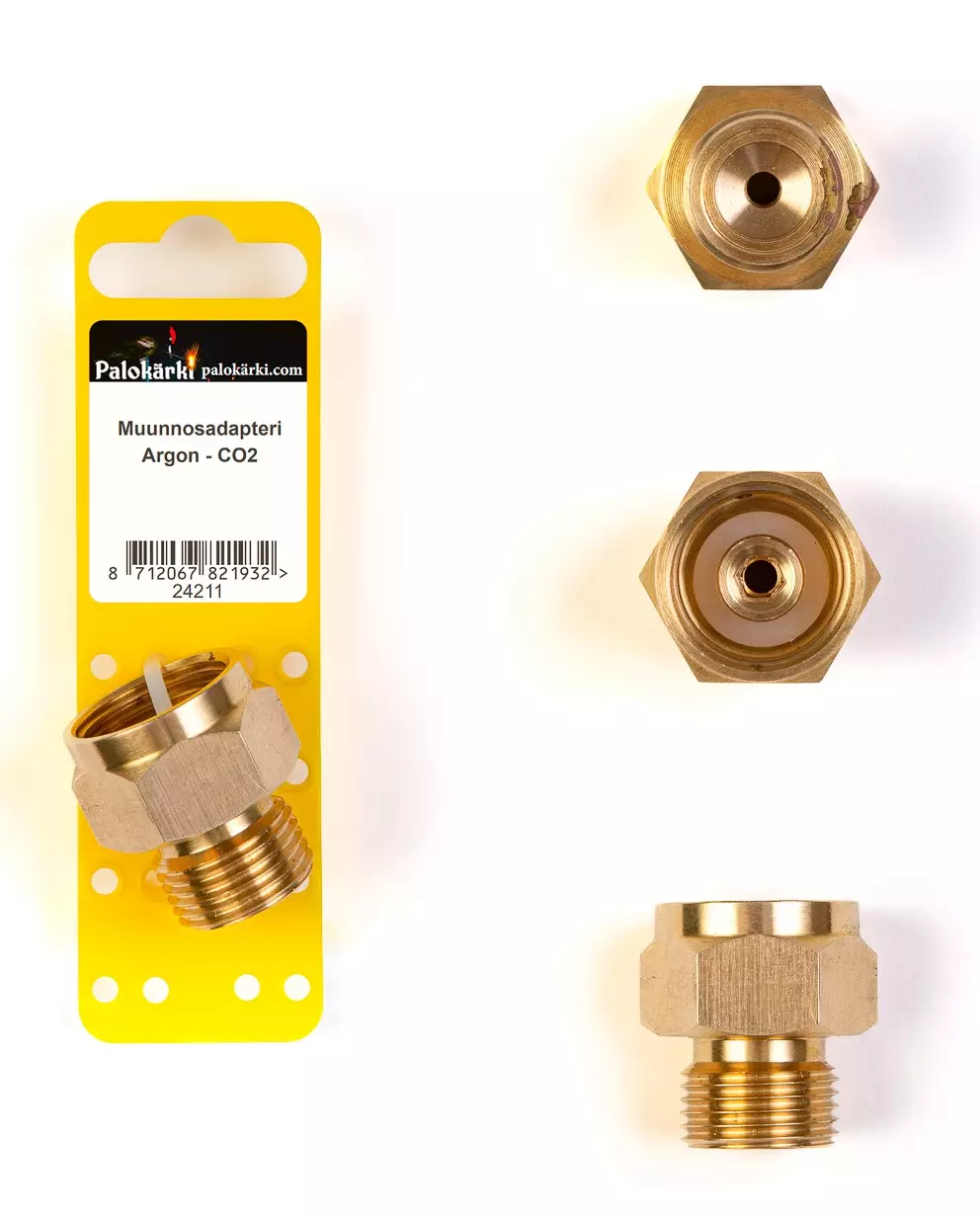 Täysmessinkinen muunnosadapteri Hiilidioksidi CO2 virtaussäätimen sovittamiseksi Argon-AR tai Argonseos AR+CO2 kaasupulloon. Liitäntäkierteet: Sisäkierre W24,32 x 1/14 tiivisteellä. Ulkokierre W21,8 x 1/14.