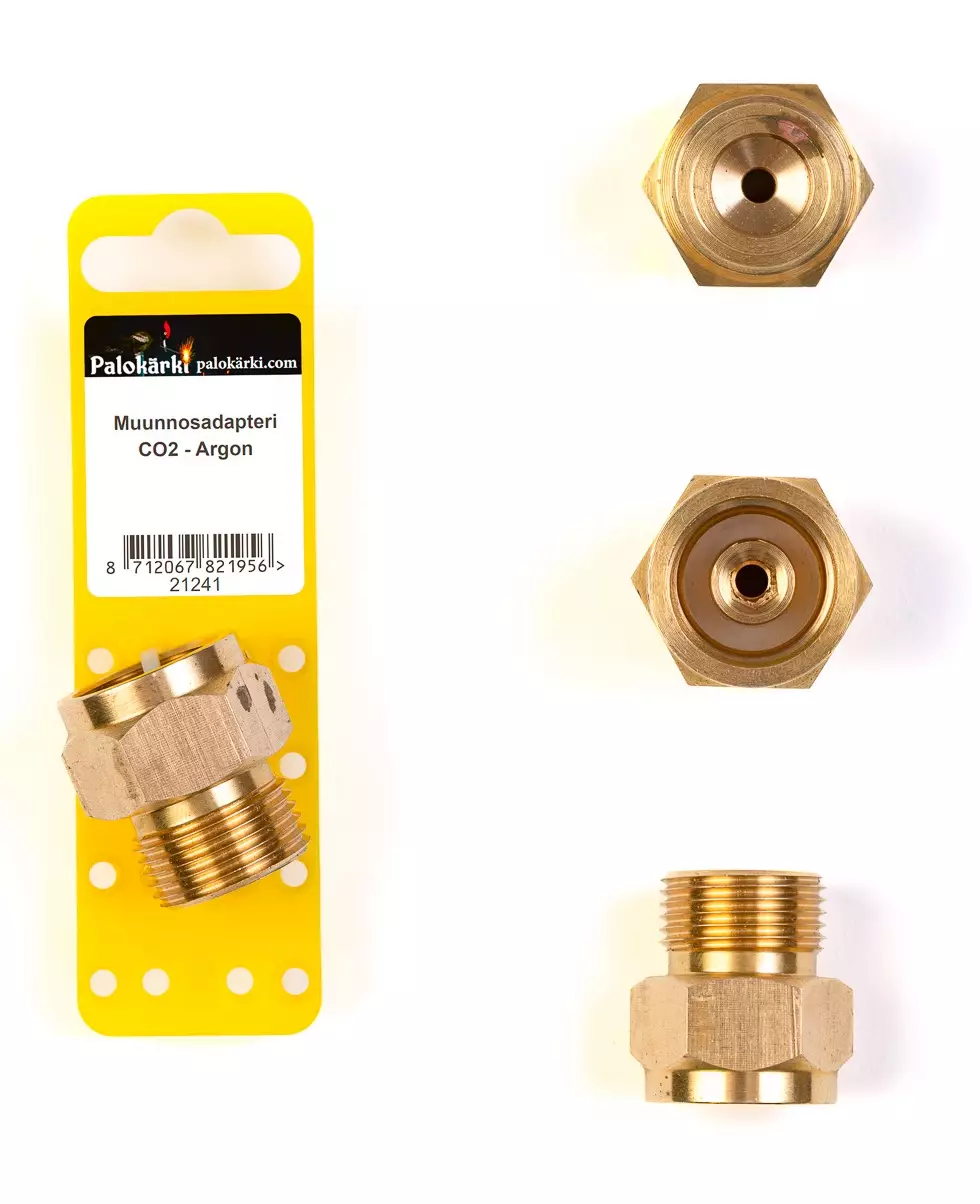 Täysmessinkinen muunnosadapteri Argon-AR tai Argonseos AR+CO2 virtaussäätimen sovittamiseksi Hiilidioksidi-CO2 kaasupulloon. 21,80 x 1,814 sisäkierre tiivisteellä 24,32 x 1,814 ulkokierre.