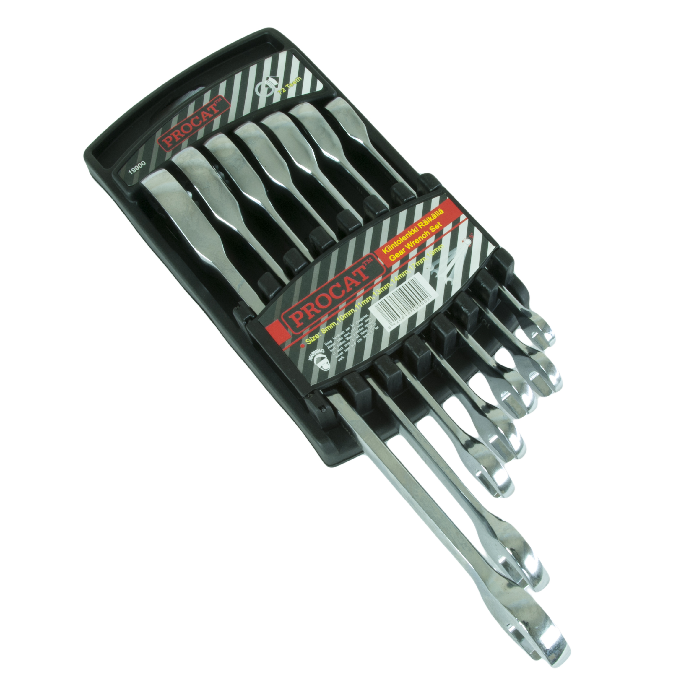 Chrome vanadium räikkälenkkisarja muovisessa suljettavassa säilytyskotelossa. Sisältää avaimet: 8, 10, 11, 13, 14, 17 ja 19 mm. Hampaiden määrä 72 kpl.