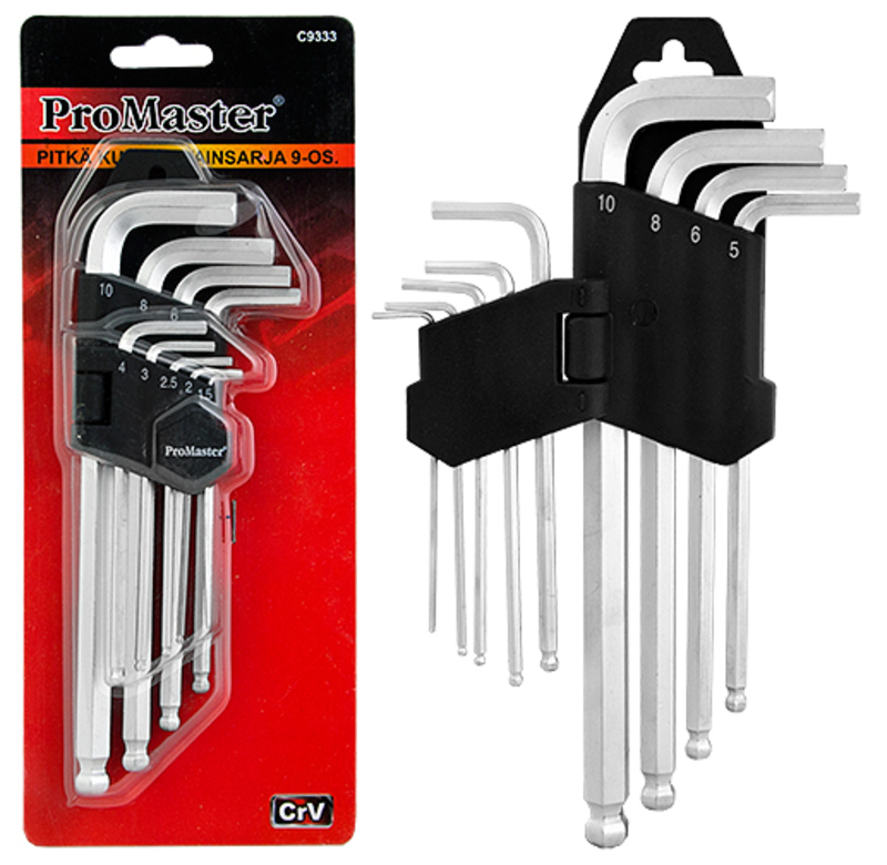 ProMaster -kromi-vanadium -terästä -9-osainen sarja sisältää koot 1.5 mm, 2.0 mm, 2.5 mm, 3.0 mm, 4.0 mm, 5.0 mm, 6.0 mm, 8.0 mm ja 10.0 mm -pitkä malli -toinen pää kuusiopallo -mukana... Lue lisää