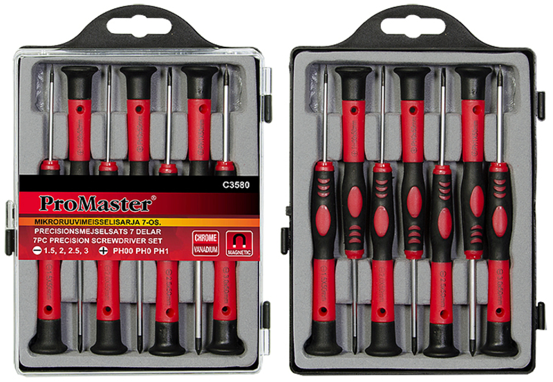 ProMaster -kromivanadium -terästä -muotoiltu kaksikomponenttikahva, magnetisoitu kärki ja ripustusreikä -pyörivä pää helpottaa ruuvausta -7-osainen sarja sisältää --ura 1.5x50, 2x50... Lue lisää