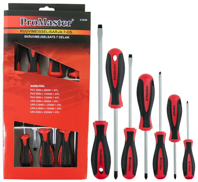 ProMaster -kromi-vanadium -terästä -7-osainen sarja sisältää seuraavat ruuvimeisselit: --4 kpl ura: 4x80mm, 5.5x125mm, 6.5x150mm, 8x200mm --3 kpl Phillips: PH1x80mm, PH2x100mm, PH3x150mm... Lue lisää