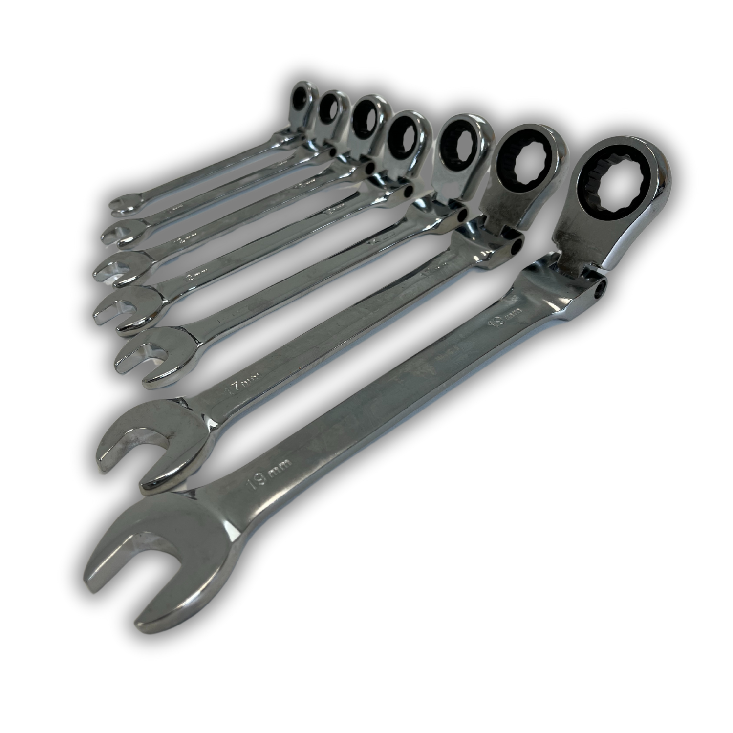 Kestävästä kromivandatiumteräksestä valmistettu 7-osainen työkalusarja. Räikkälenkkiavainsarja sisältää 8mm, 10mm, 12mm, 13mm, 14mm, 17mm ja 19mm kiintoavaimet. Kromiviimeistely. Tällä nivelletyllä sarjalla työskentelet helposti myös ahtaissa paikoissa. Räikkälenkeissä on tiheä hammastus, joten työskentely on nopeaa ja vaivatonta.
