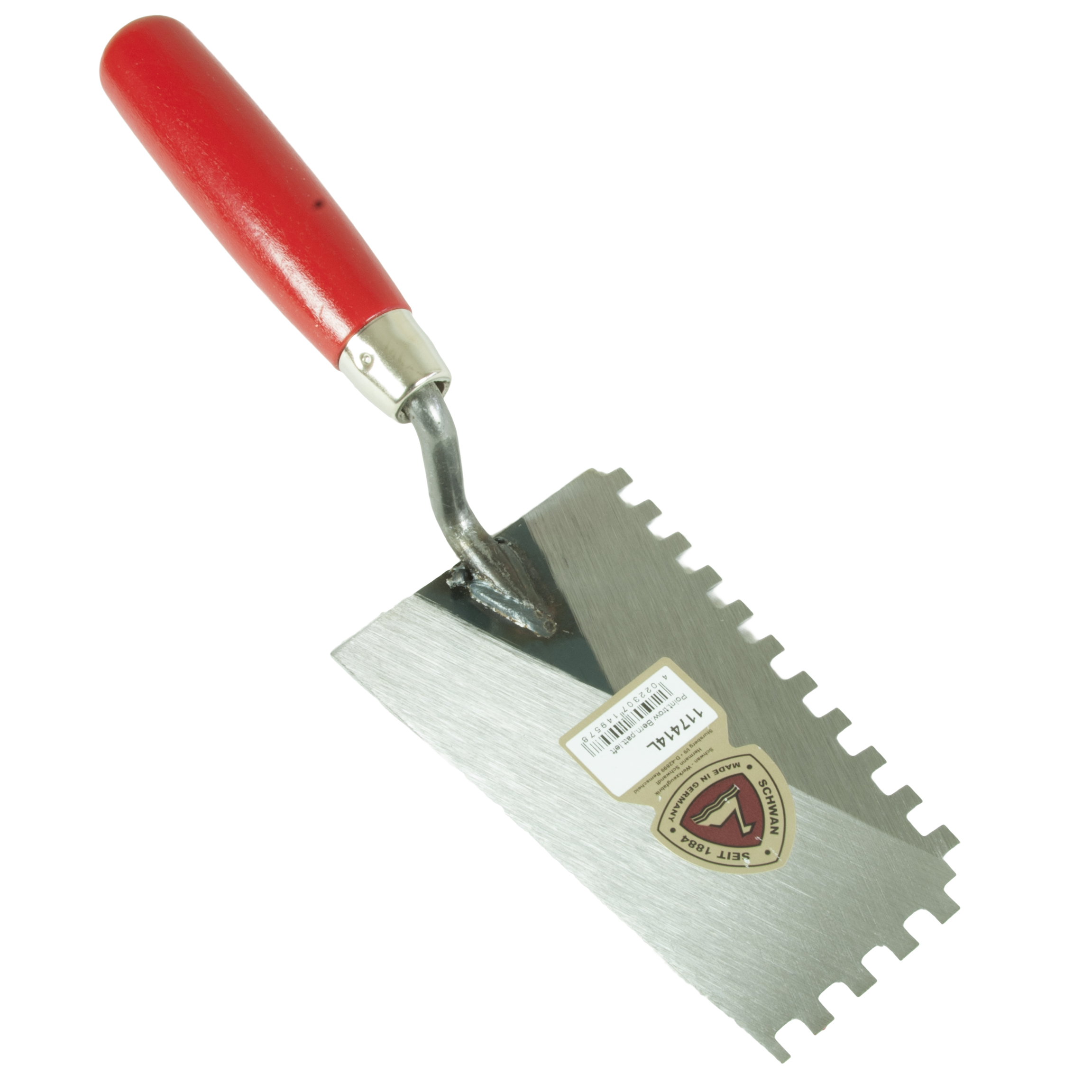 Tasakärkinen teräksestä valmistettu hammastettu putskauha puisella kahvalla. Putskauhat ovat muurauksessa ja laatoituksessa käytettäviä yleistyökaluja, joiden avulla laastia voidaan joko... Lue lisää
