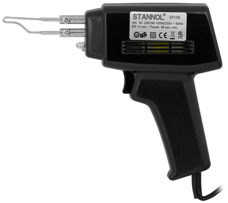 Stannol -teho 100 W / 230 V -johto n. 1,3 m -kohdevalo -lämpenee nopeasti, n. 380°C lämpötilaan n. 6 sekunnissa -mukana yksi juotoskärki tinakolvi