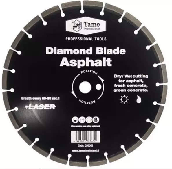 Segmentti paloitettu asfaltin katkaisulaikka. Soveltuu asfaltin, tuorebetonin (alle 48h), vihreän betonin kuivakatkaisuun laikka- ja asfalttileikkurilla. Keskiöreikä 25,4mm. Tuotepakkaus sisältää soviterenkaan 22,2mm.