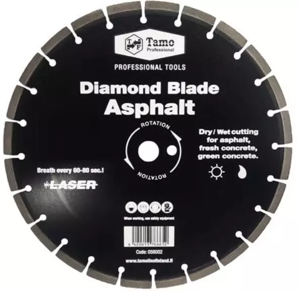 Segmentti paloitettu asfaltin katkaisulaikka. Soveltuu asfaltin, tuorebetonin (alle 48h), vihreän betonin kuivakatkaisuun laikka- ja asfalttileikkurilla. Keskiöreikä 25,4mm. Tuotepakkaus sisältää soviterenkaan 22,2mm.