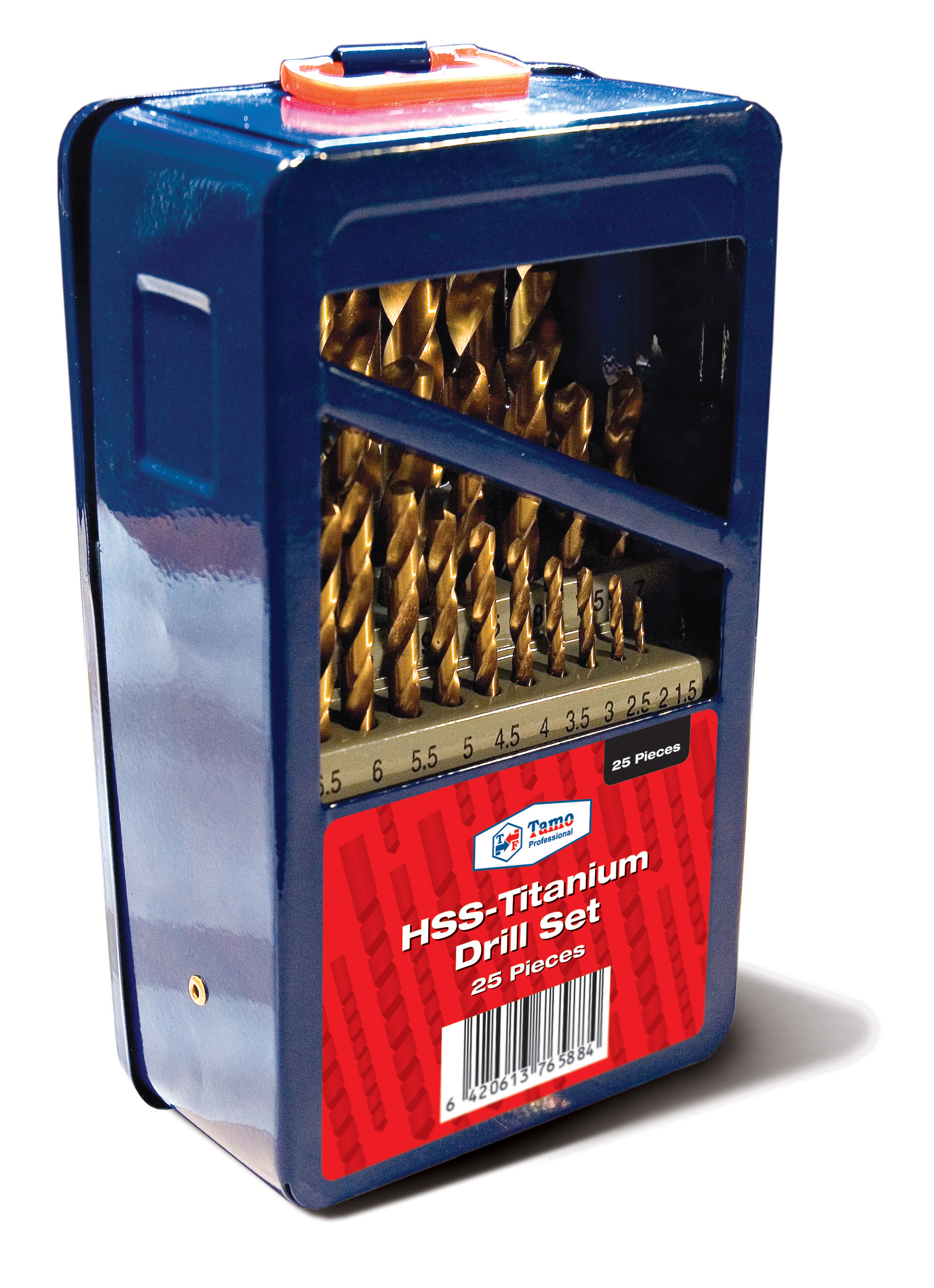 25-osainen metallinporanteräsarja kestävällä titaniumpinnoitteella erillaisten metallien poraukseen. Sisältää koot 1-13mm. Materiaali HSS 4241 HRC 52-56, titaanipäällysteinen. Soveltuu kaikkiin tavallisiin porakoneisiin ja iskuporakoneisiin.