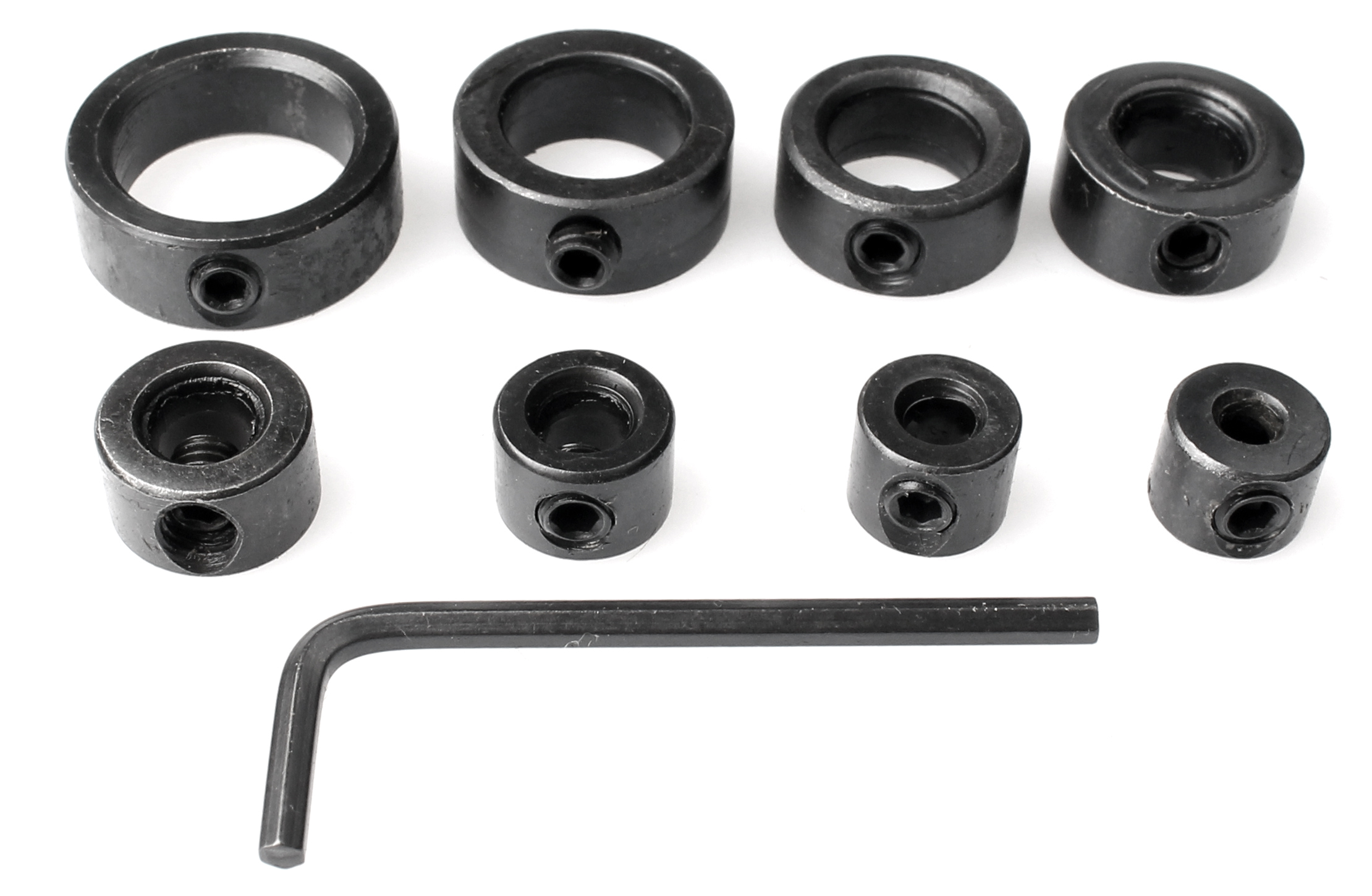 Poraussyvyyden rajoitin sarja. Sisältää koot 3mm, 4mm, 5mm, 6mm, 8mm, 10mm ja 12mm sekä kuusiokoloavaimen, jonka avulla rajoitin asetetaan oikeaan kohtaa.