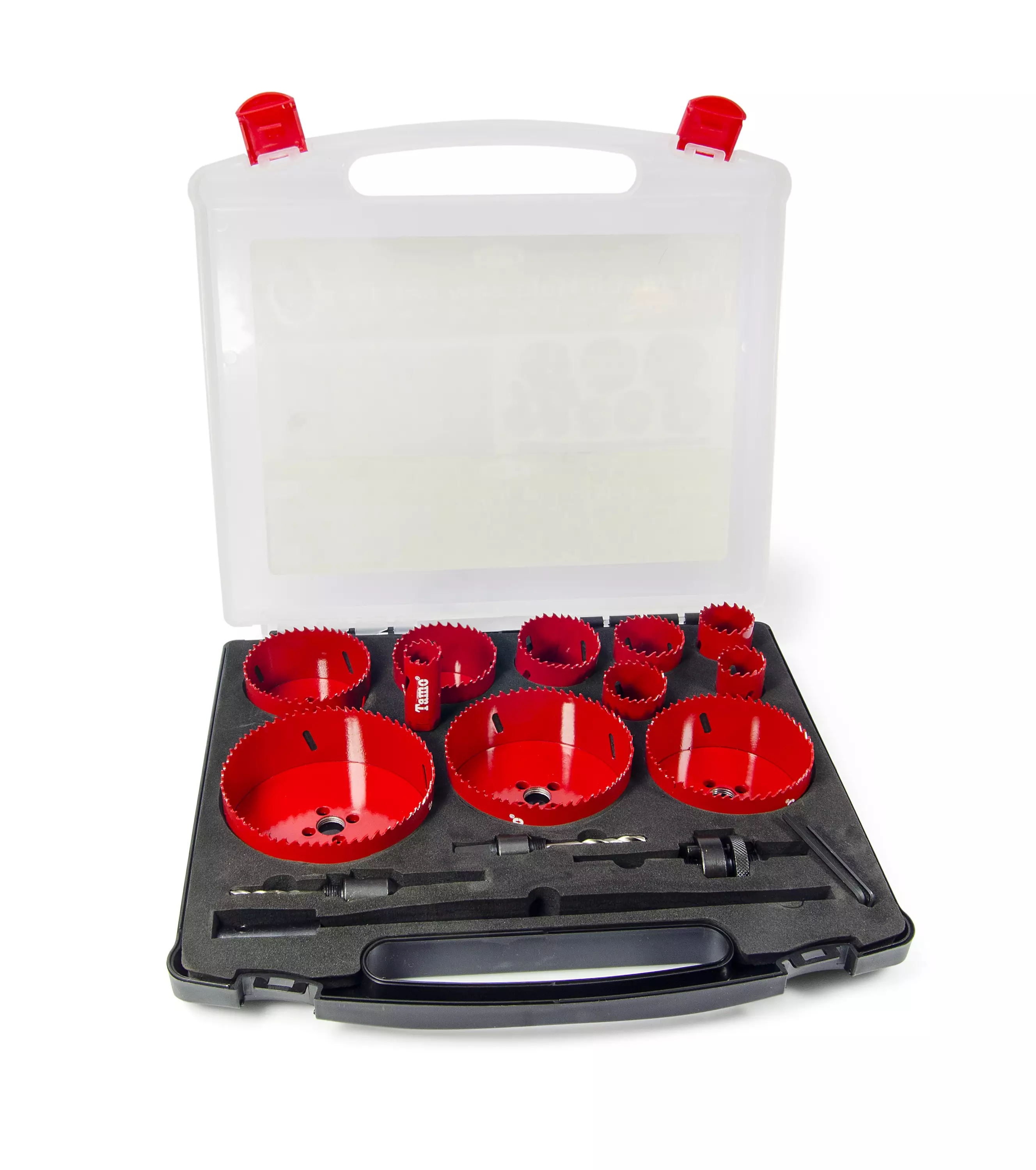 Bi-metalli HSS reikäsaha setti. Sis. 22,29,35,38,44,51,64,76,92,105,114mm, ison ja pienen karan sekä 300mm jatkovarren. Työstettävät materiaalit ovat mm: Teräs, alumiini, kupari, messinki, puu... Lue lisää