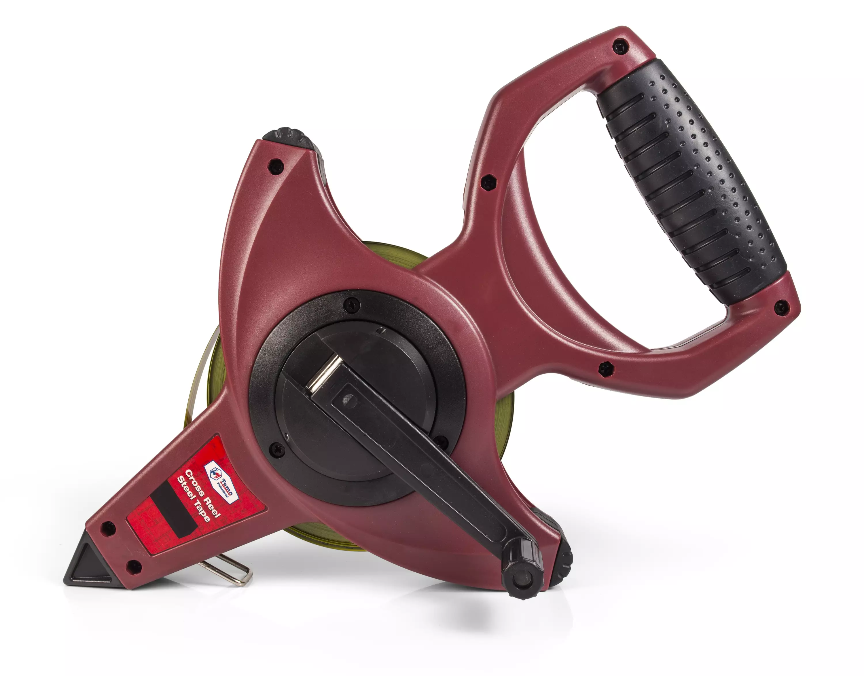 Ristikelamitta kulutusta kestävälllä teräsnauhan leveys 12 mm. Selkeä millimetrijaotus keltaisella pohjalla. Umpinainen suojattu kela, taitettavalla kammella. Kolminkertainen kelausnopeus.