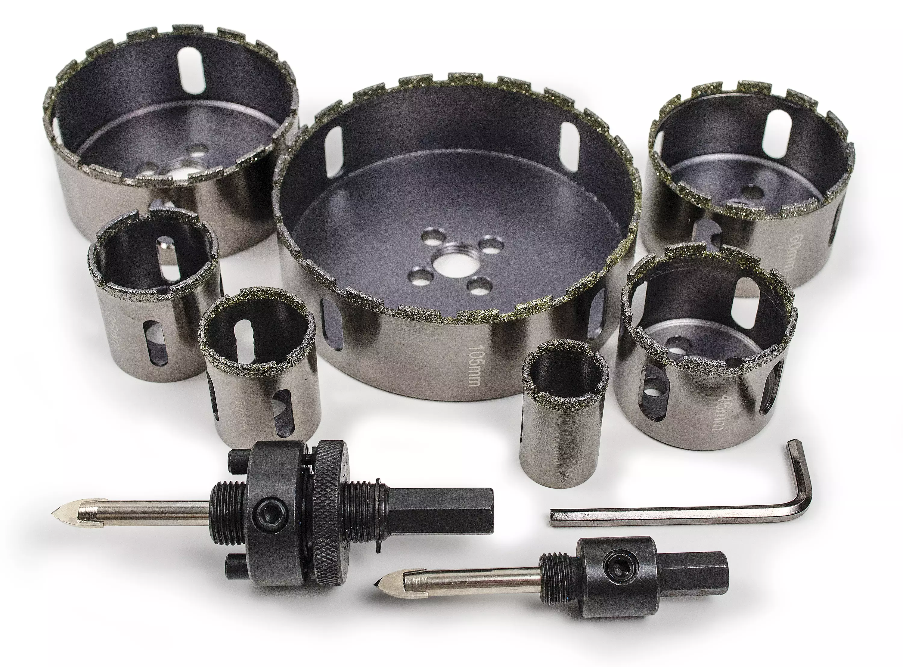10-osainen timanttireikäsahasarja. Soveltuut mm: keraamiset laatat, posliini, tiili, lasi sekä muut erilaiset kivimateriaalit. Sisältää suosituimmat koot: 22, 30, 35, 46, 60, 76 ja 105mm. Pienen ja ison istukan timanttireikäsahoille ja kuusiokoloavaimen.