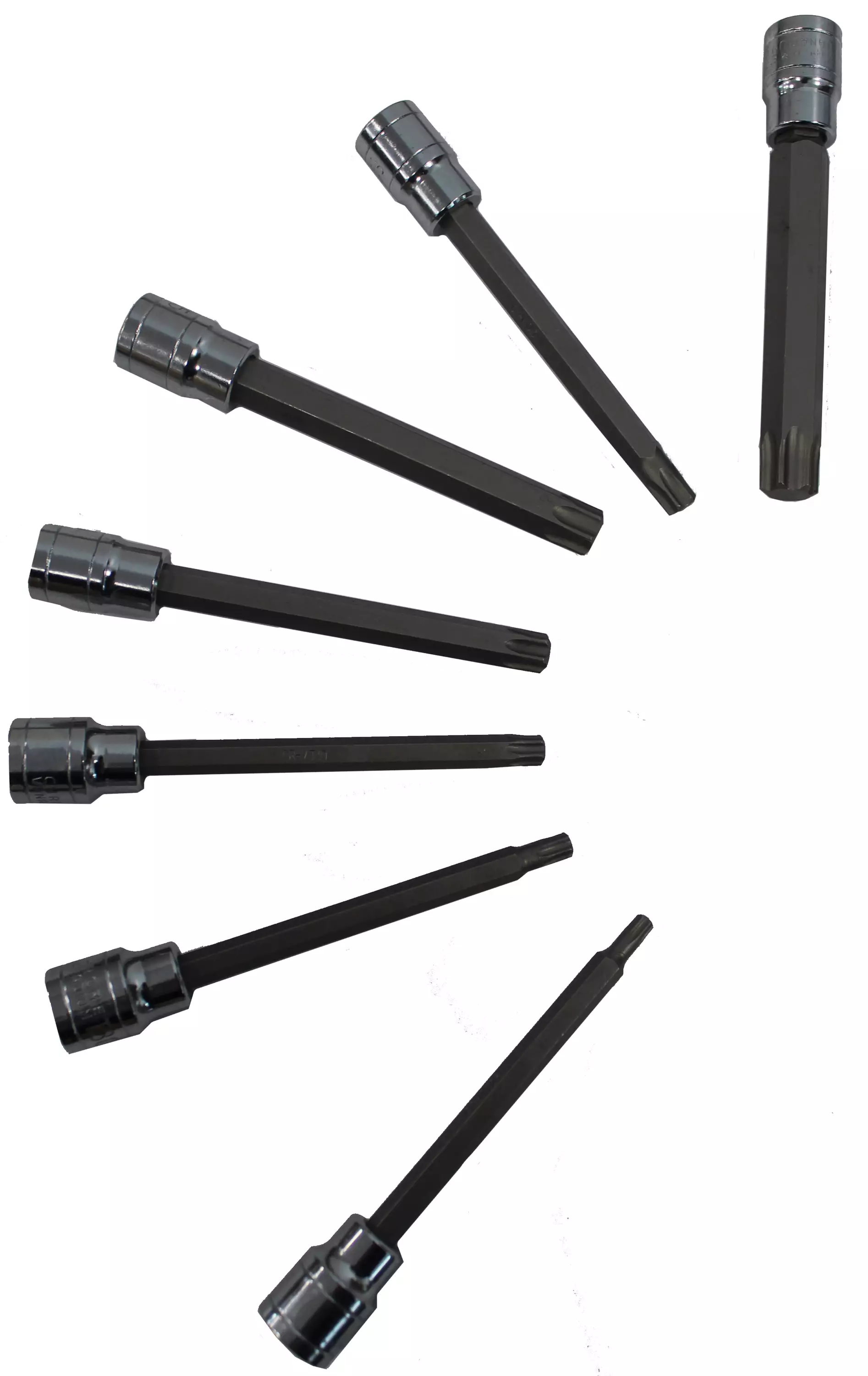 Kattava 7-osainen torxkärkisarja on erinomainen työkalusarja kotipajaan ja korjaamolle. Laadukkaassa torxkärkisarjassa on seitsemän erikokoista torx kärkihylsyä monipuolisiin ja vaativiin asennuksiin. Kärkisarjan torxkärkien pituus on 110 mm, joten torxavaimella on helppo ylettää myös haasteellisiin kohteisiin. Torx kärkihylsy on varustettu 3/8" karalla, joten kärjet soveltuvat käytettäväksi 3/8" räikkävääntimissä. Monipuolinne torxkärkisarja sisältää torxavain koot T25-T60.