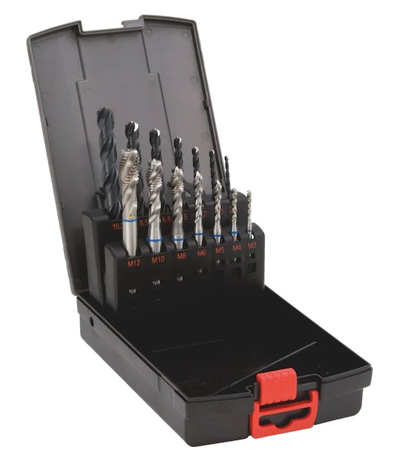 14 osaa, sisältää tarkkuuskierukkaporanteriä ja kierretappeja pohjareiälle pitkälastuisten seostamattomien terästen työstämiseen 850 N/mm²:n lujuuteen asti.
