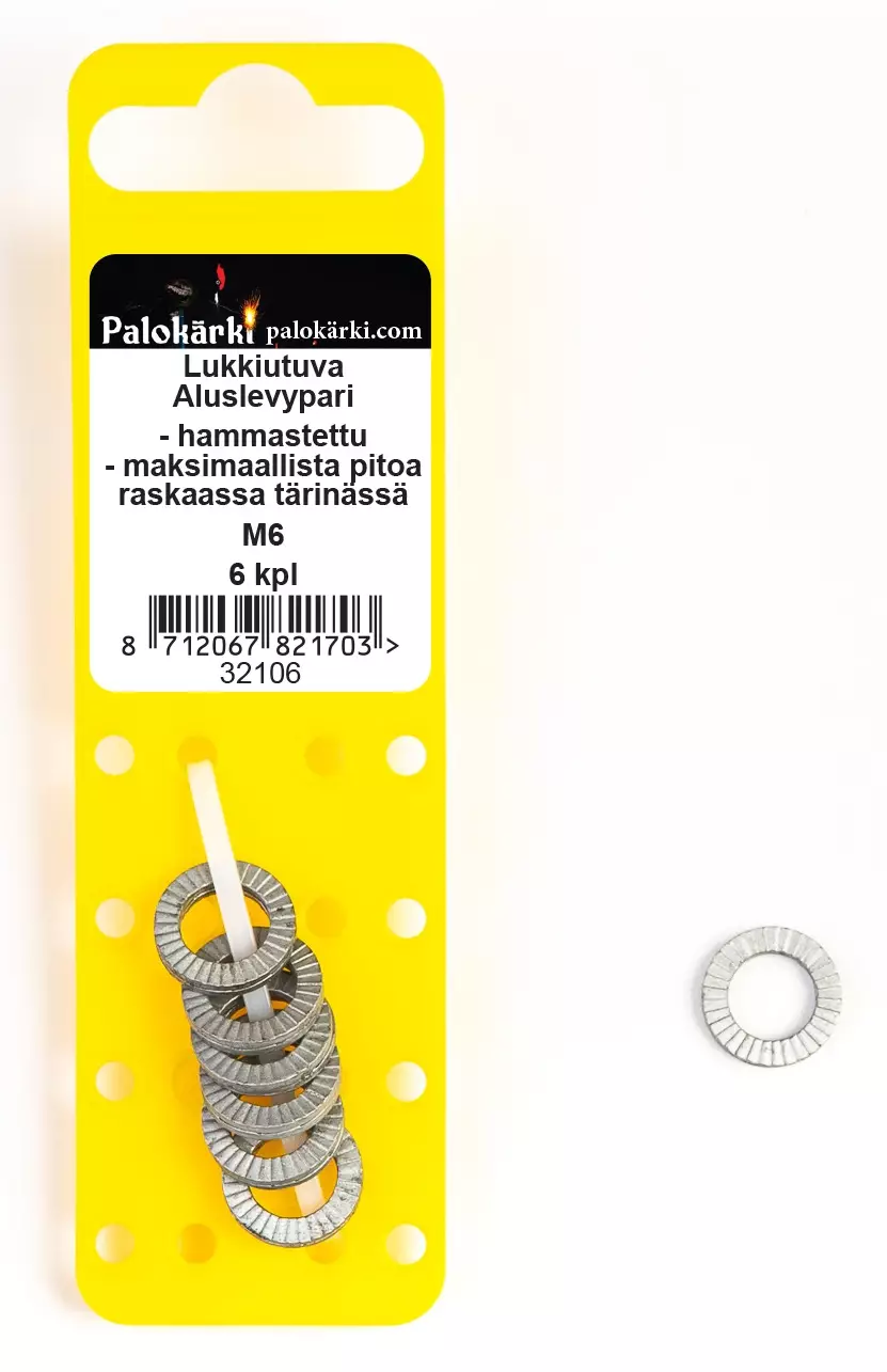 Hakusanat: lukkiutuva aluslevy, aluslevypari, tärinänkestävä aluslevy, Palokärki aluslevy, ruuviliitoksen lukitus, aluslevyt M6 M8 M10 M12