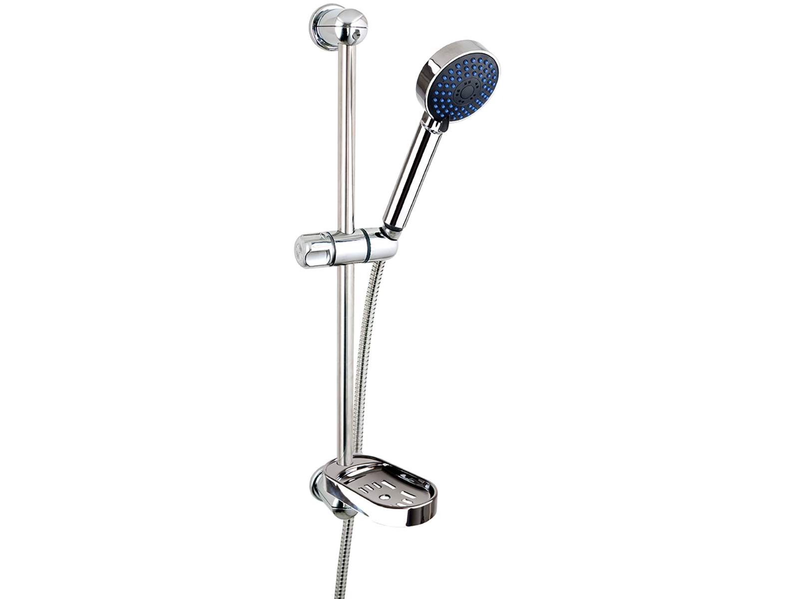 Moderni krominen suihkusetti, 59,2 cm tanko Ø93 mm suihkukahva kolmella suihkutyypillä, Liukuva suhkukahvan pidike ja varressa saippuakuppi,
