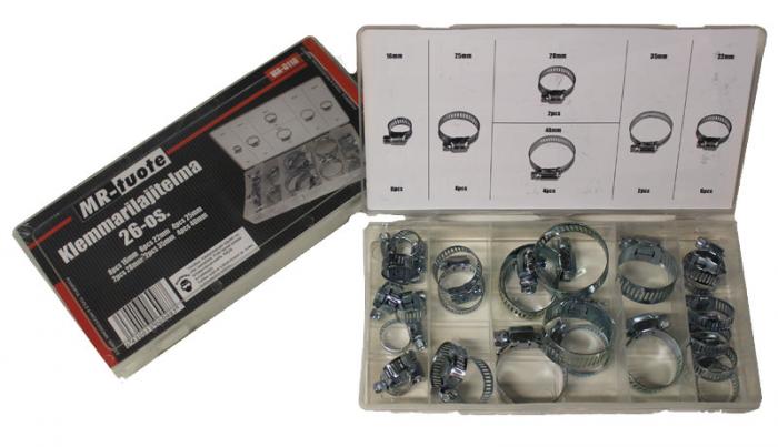 Laadukas ja monipuolinen letkunsidelajitelma erikokoisia letkunsiteitä monipuolisii kiristyksiin ja asennuksiin. Monipuolinen 26-osainen klemmarilajitelma sisältää kattavan lajitelman letkunkiristimiä, joiden halkaisijat ovat 16 mm, 22 mm, 25 mm, 28 mm, 35 mm ja 40 mm. Helposti ruuvilla kiristettävä luja ja kestävä letkunkiristin soveltuu asennettavaksi erilaisten putkien sekä letkujen ympärille. Klemmarilajitelman mukana tulee kätevä lokeroitu säilytyskotelo letkunklemmareiden säilytykseen.
